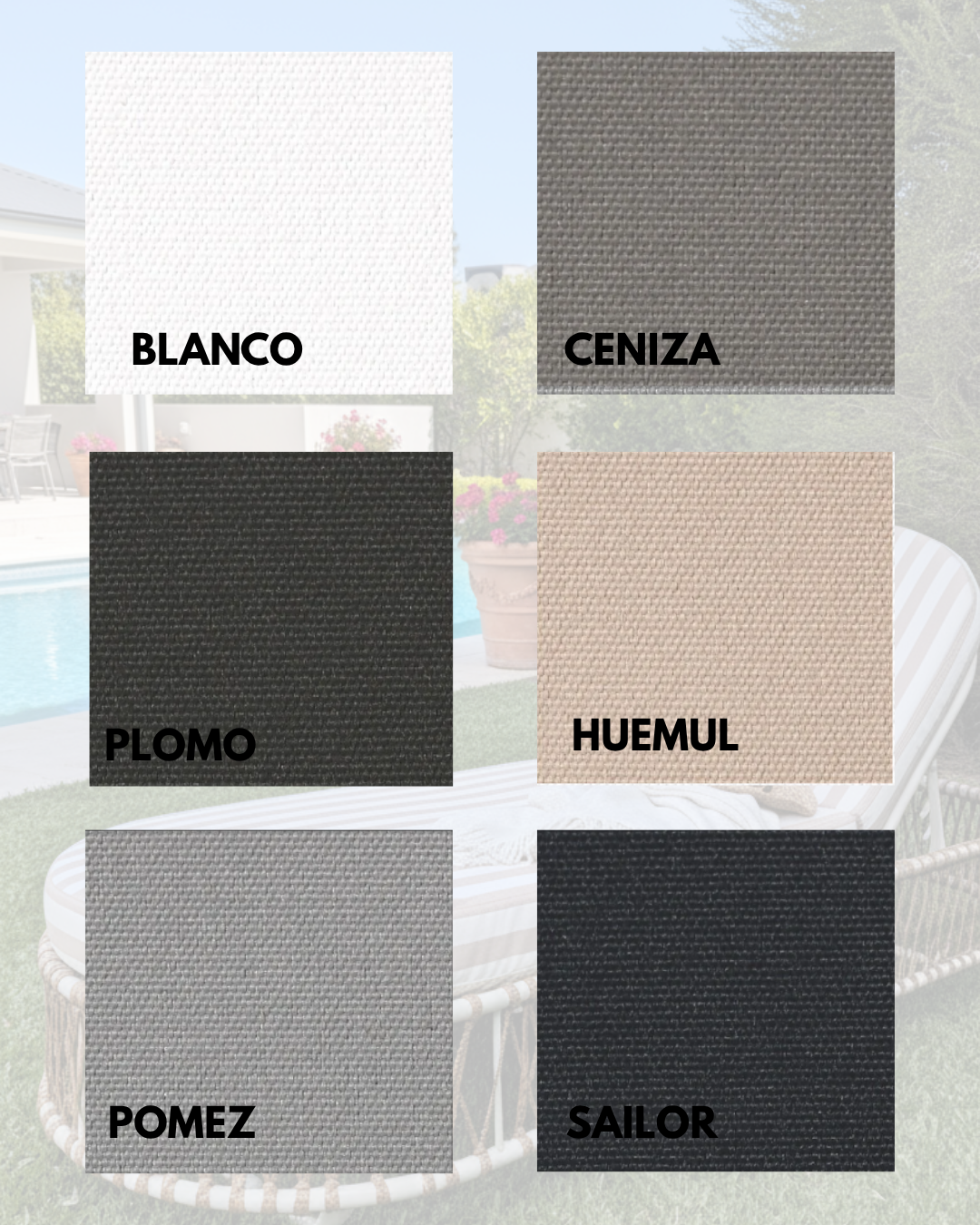 | Color tapizado almohadon | AMALFI BLANCO, AMALFI CENIZA, AMALFI HUEMUL, AMALFI PLOMO, AMALFI POMEZ, AMALFI SAILOR, AZUL LINEAS CRUDO, MAIZ LINEAS BLANCAS, BEIGE LINEAS CRUDO, CELESTE LINEAS ROJAS, CELESTE LINEAS VERDES, CRUDO LINEAS ANCHAS BEIGE |
