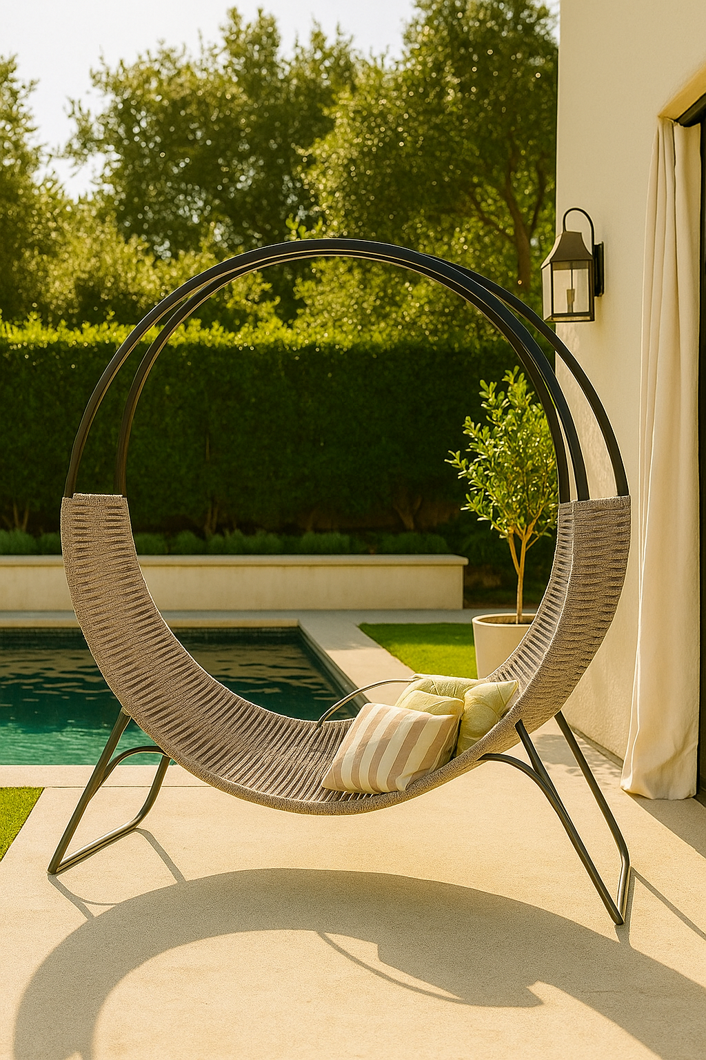 Camastro Buzios: elegante y moderno, fabricado en caño resistente y tejido en soga de polipropileno, con un diseño que combina confort y estilo para exteriores. Ideal para disfrutar del sol o relajarse junto a la piscina.