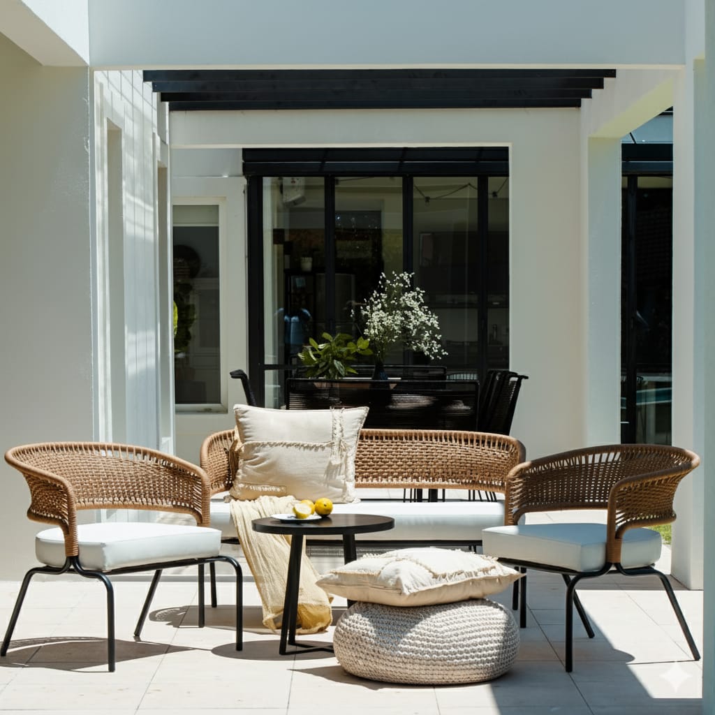 Elegancia y confort en un mismo conjunto. Incluye dos poltronas, un sillón doble y la mesa NAPOLES que acompaña. Diseño versátil que se adapta tanto a interiores como a exteriores. Sus líneas modernas y su tejido artesanal aportan calidez, mientras que su comodidad lo convierte en el rincón ideal para disfrutar momentos de relax solo o acompañado.