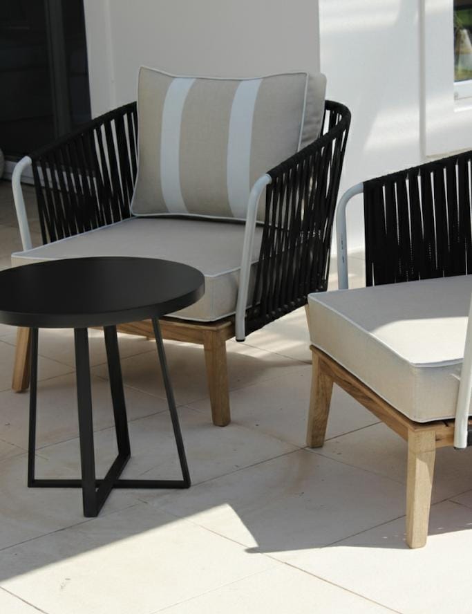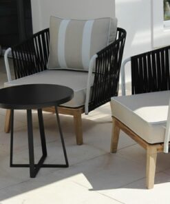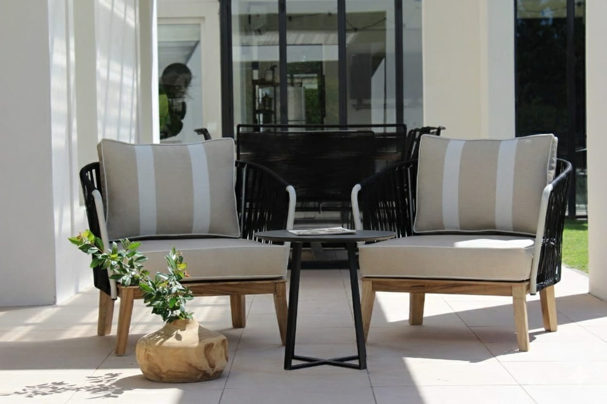 Un espacio de encuentro con estilo y confort. El combo incluye el sillón Terra , con estructura de madera maciza de petiribí y asiento tejido artesanalmente, y la mesa Nápoles, fabricada en hierro con tapa de chapa. La combinación de materiales nobles y diseño moderno crea un conjunto versátil, ideal para living, galerías o espacios de exterior semicubiertos.