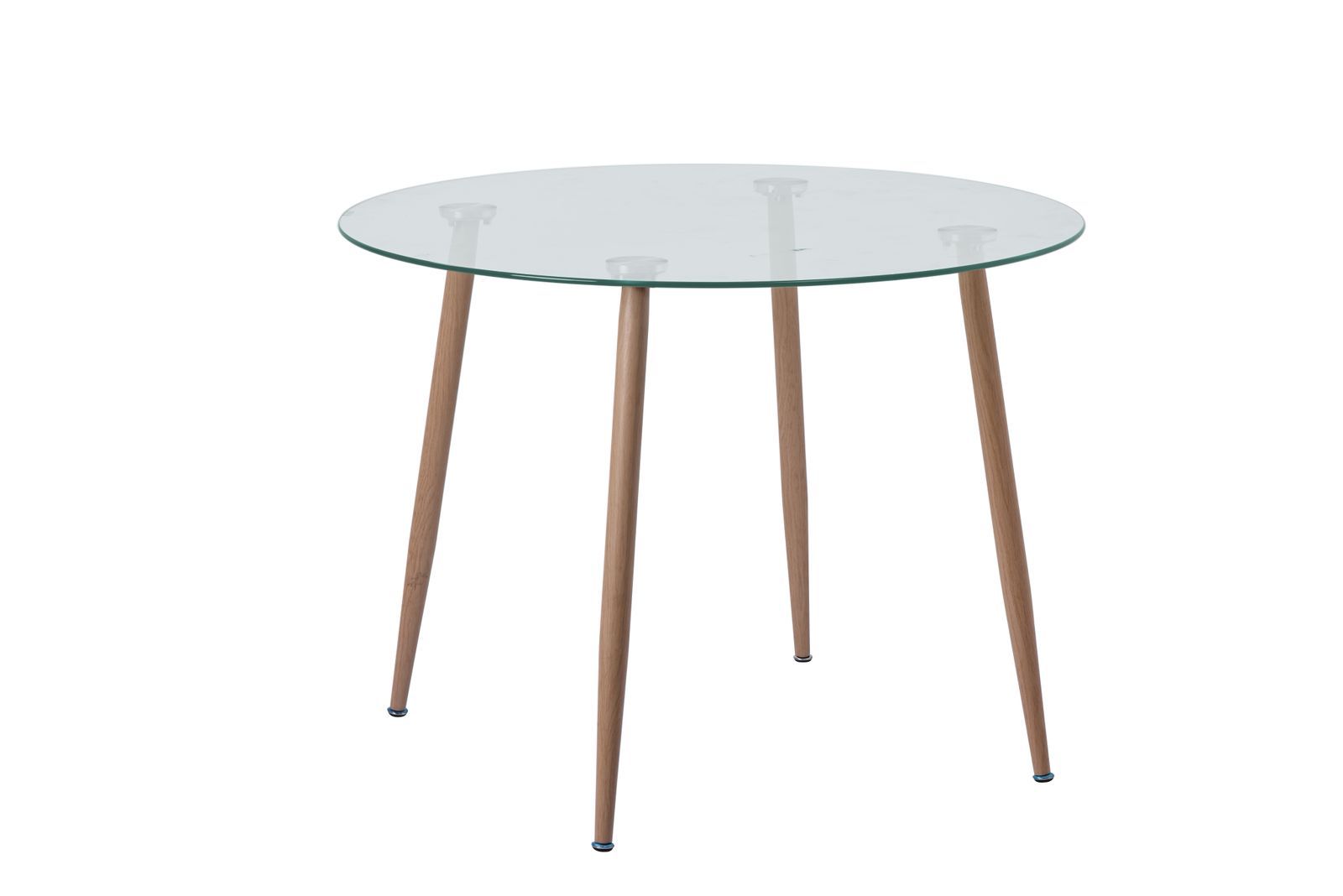 Diseño moderno y versátil que combina elegancia y funcionalidad. Esta mesa redonda cuenta con una cubierta de vidrio transparente, que aporta ligereza visual y un estilo contemporáneo. Sus cuatro patas metálicas, delgadas y estilizadas, tienen un acabado que imita la apariencia de la madera natural, brindando un equilibrio perfecto entre resistencia y calidez estética. Ideal para comedores pequeños, cocinas, salas de juntas o espacios de estilo minimalista.