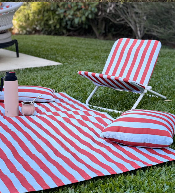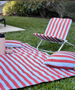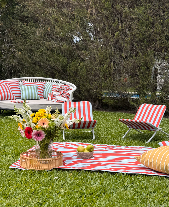 Reposera SUMMER, confeccionada en tela impermeable, ideal para usar al aire libre. Su diseño liviano y practico aporta estilo y confort. Perfecta para picnics, terrazas, playa o jardín.