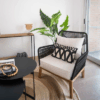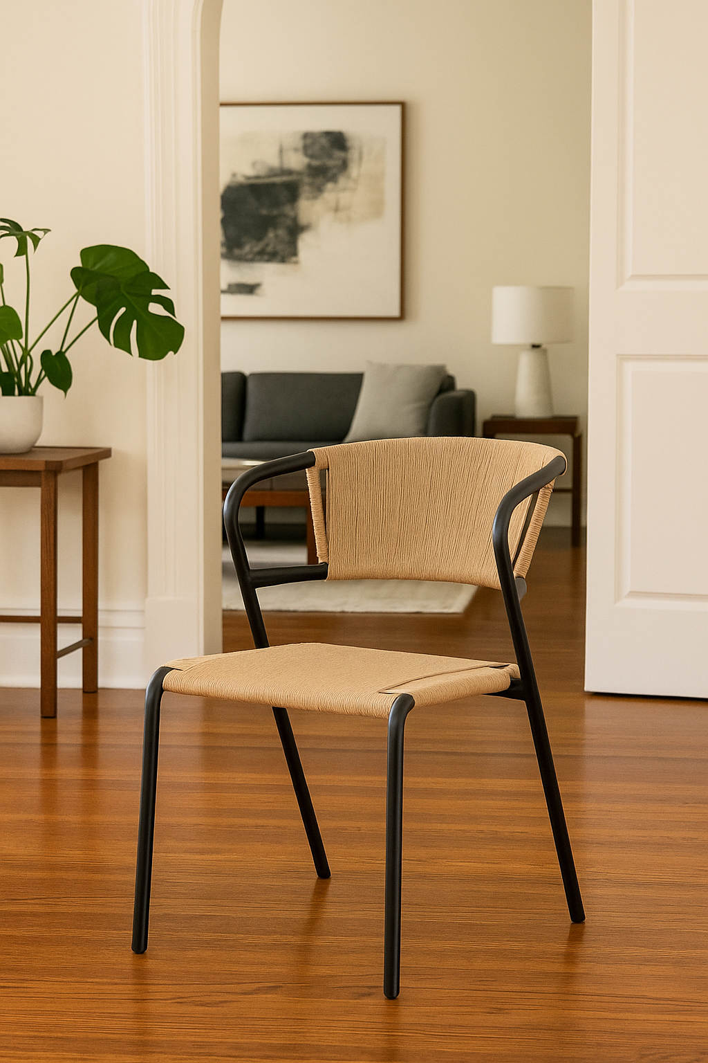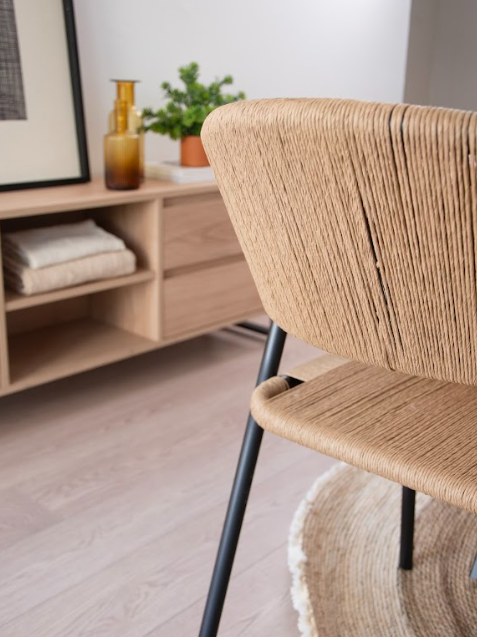 Un diseño que une resistencia y calidez artesanal. Su estructura está fabricada en caño pintado a horno, lo que garantiza firmeza, durabilidad y un estilo moderno. El asiento y respaldo se encuentran tejidos a mano en papel kraft, logrando un entramado cómodo, flexible y de gran atractivo visual.
