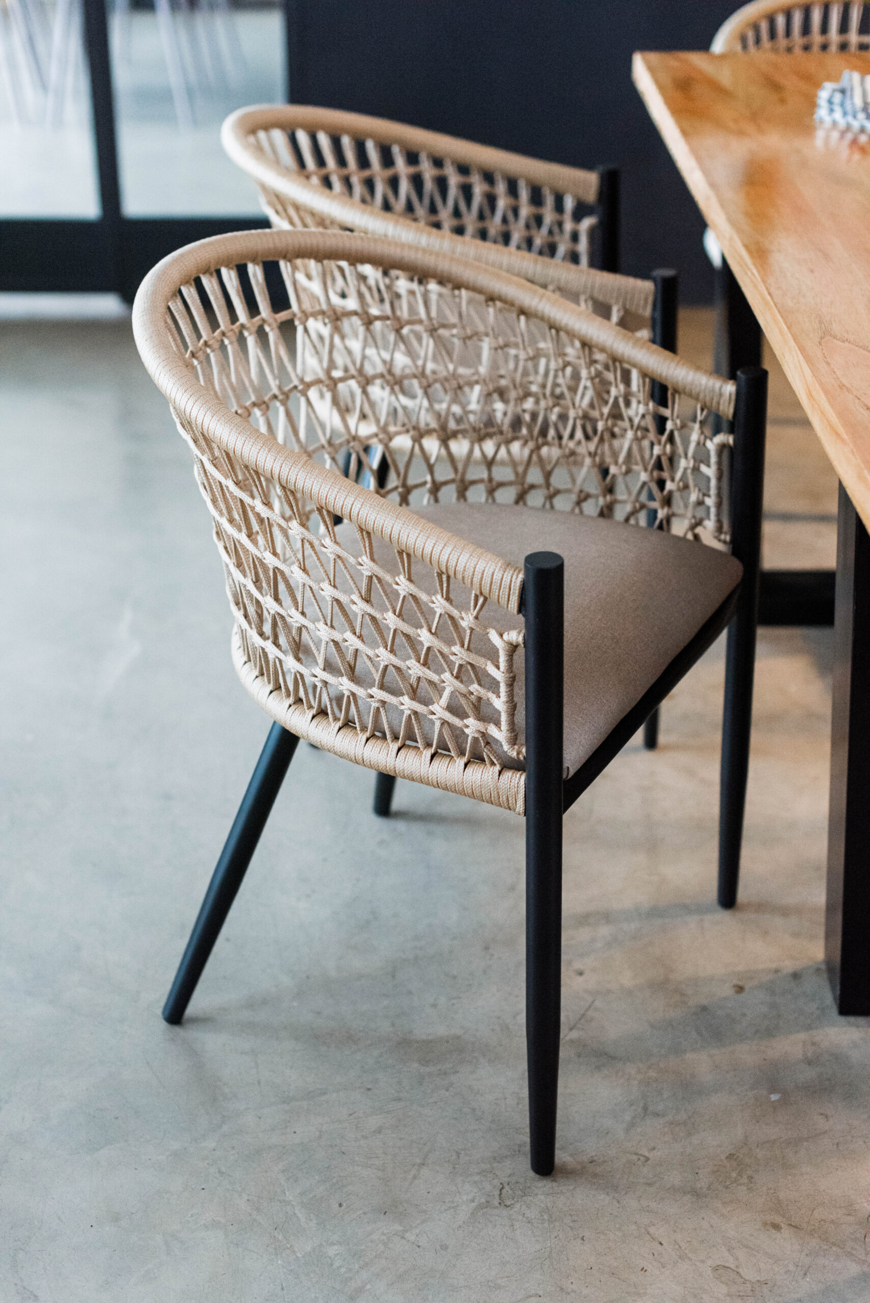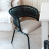 Cuenta con un novedoso tejido en cordón plano de polipropileno trenzado y asiento tapizado en género Fiore (lavable, impermeable y antihongos) Además tiene exquisitos detalles de terminación, cómo ser sus patas con terminación cónica ya sea en hierro o en madera.