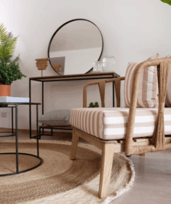 Su armazón está fabricado en caño estructural redondo de alta resistencia, tratado con pintura epoxi con acabado a horno y tejido entrelazado realizado artesanalmente.